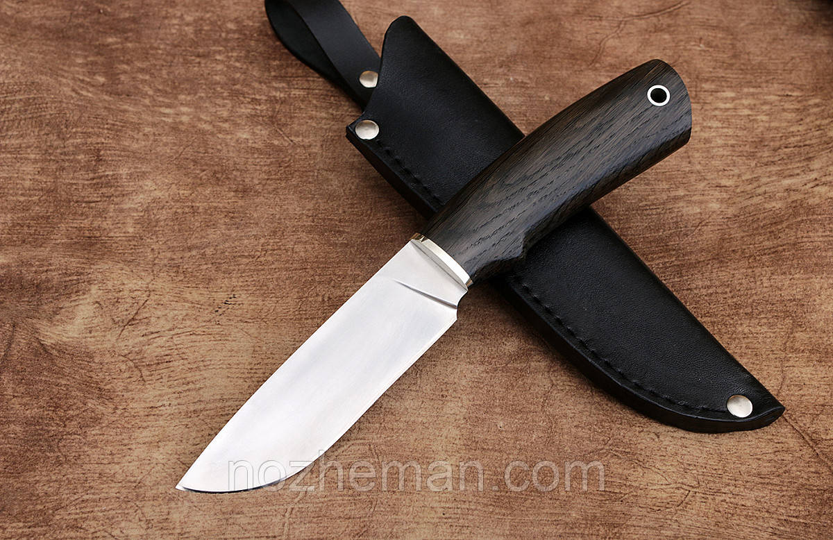 Рукоятка виготовлена з мореного дубу, больстер з мельхіору. Рукоятка має чудову міцність, маслобензостійкість, стійкість до вологи, довговічна і технологічна. Тепла на морозі, приємна на дотик і не ковзає навіть у мокрій руці. Спеціальне оздоблення рукояті забезпечує комфортне утримання ножа та унікальний зовнішній вигляд. А також рукоятка має отвір під темляком.