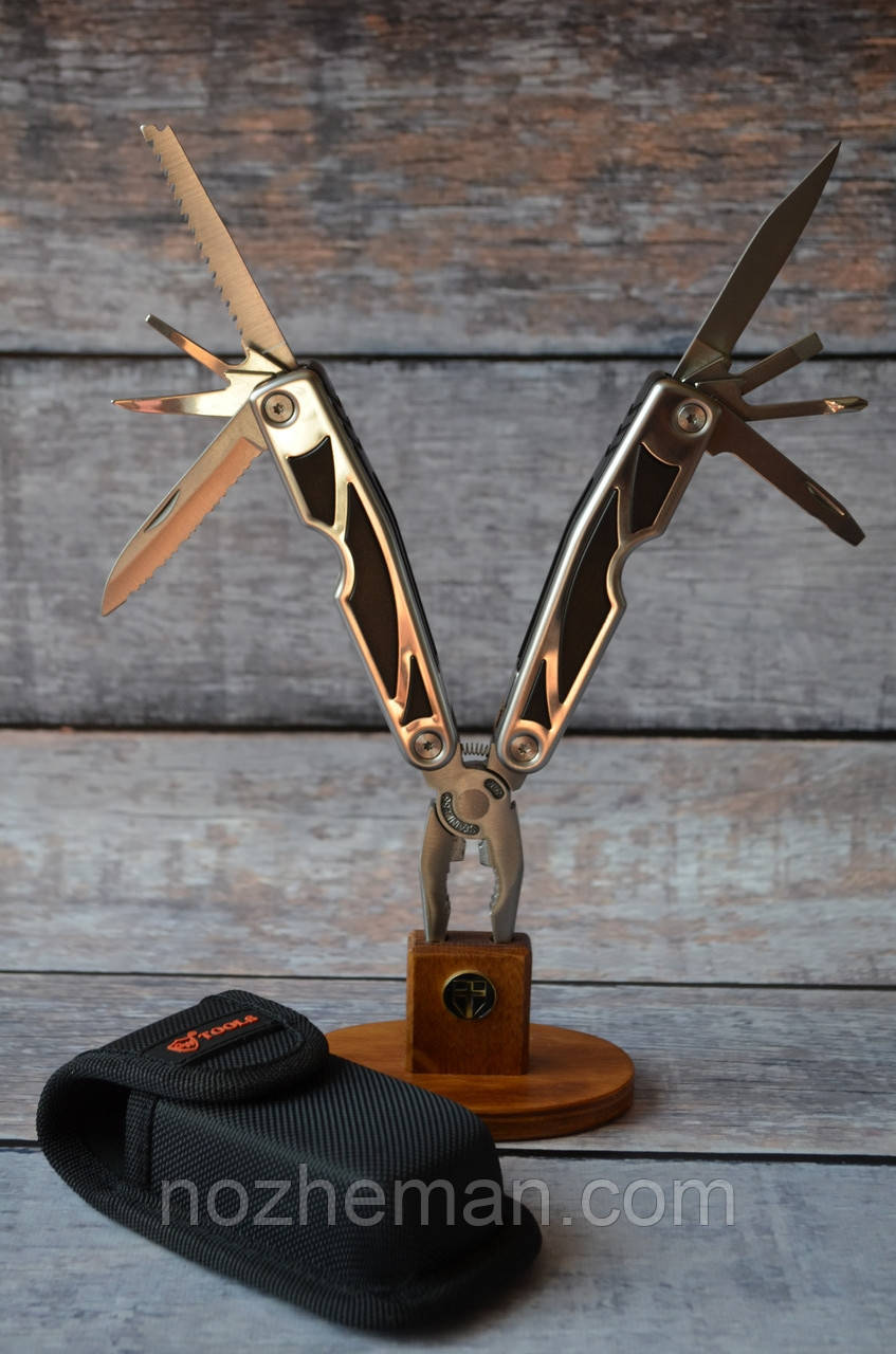 Функціонал: плоскогубці, кусачки, ніж, лезо з серрейторним заточуванням, пряма викрутка, шило, пила, хрестова викрутка.